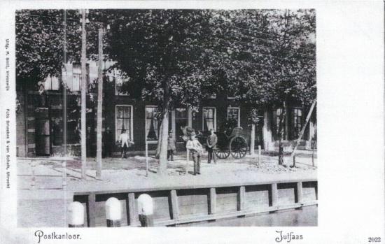 gezicht op de voorgevels van hetpostkantoor en enkele andere panden aan de herenstraat te jutphaas.